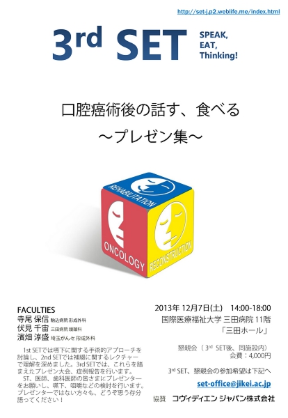 先日は、3rd SETにご参加いただきありがとうございました。 口腔外科と形成外科の関東地方会と重なり、皆さまにはご迷惑をおかけしましたが、手術、補綴、リハビリと多岐にわたる内容でディスカッションを行うことができました。 SETは一昨年の年末に企画が生まれ、皆さまのご協力とご指導のもと1年を終えることができました。来年からも年3回の開催を目標に、口腔癌患者の話す、食べるを考えていきたいと思います。 今後ともよろしくお願い致します。 SET代表 がん・感染症センター駒込病院 形成外科 寺尾保信