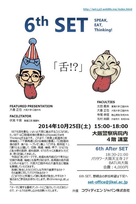 SETも回を重ね、いよいよ大阪に進出することになりました。SET は口腔癌術後の患者さんのSpeakとEatをThinkingする会です。 これまで、「舌骨上筋温存と術後機能」、「下顎再建における補綴の意義」、「口腔癌術後の話す、食べる、~プレゼン集」、「どうする、筋突起?」、「膜でとる」と題して、切除、再建、補綴、嚥下、リハビリなど各分野の医師、歯科医師、STの方々にお集まりいただき、熱く討論してきました。