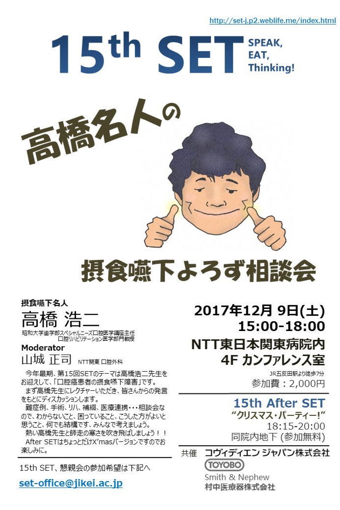 今年最期、第15回SETのテーマは高橋浩二先生をお迎えして、「口腔癌患者の摂食嚥下障害」です。